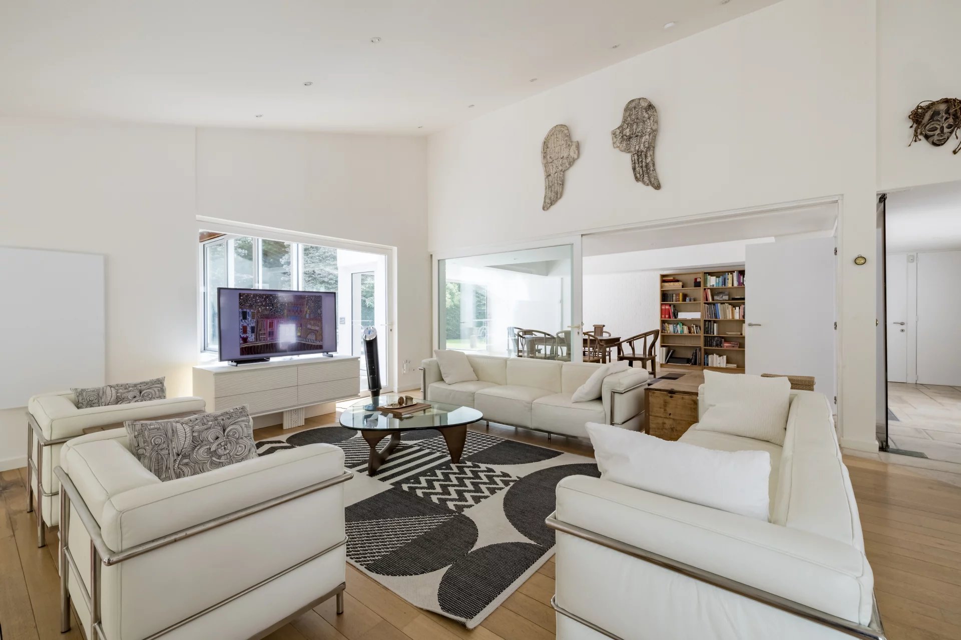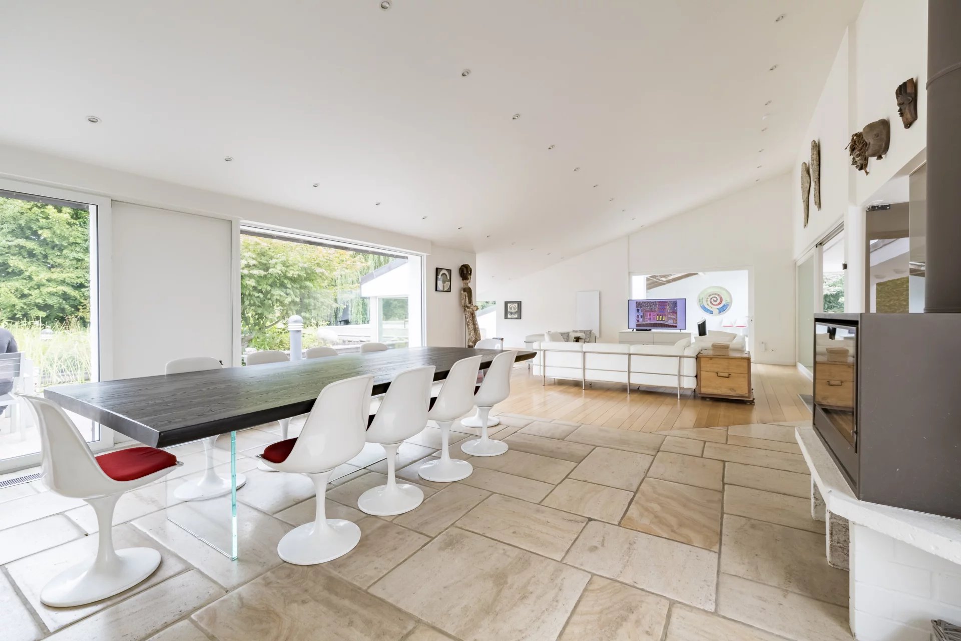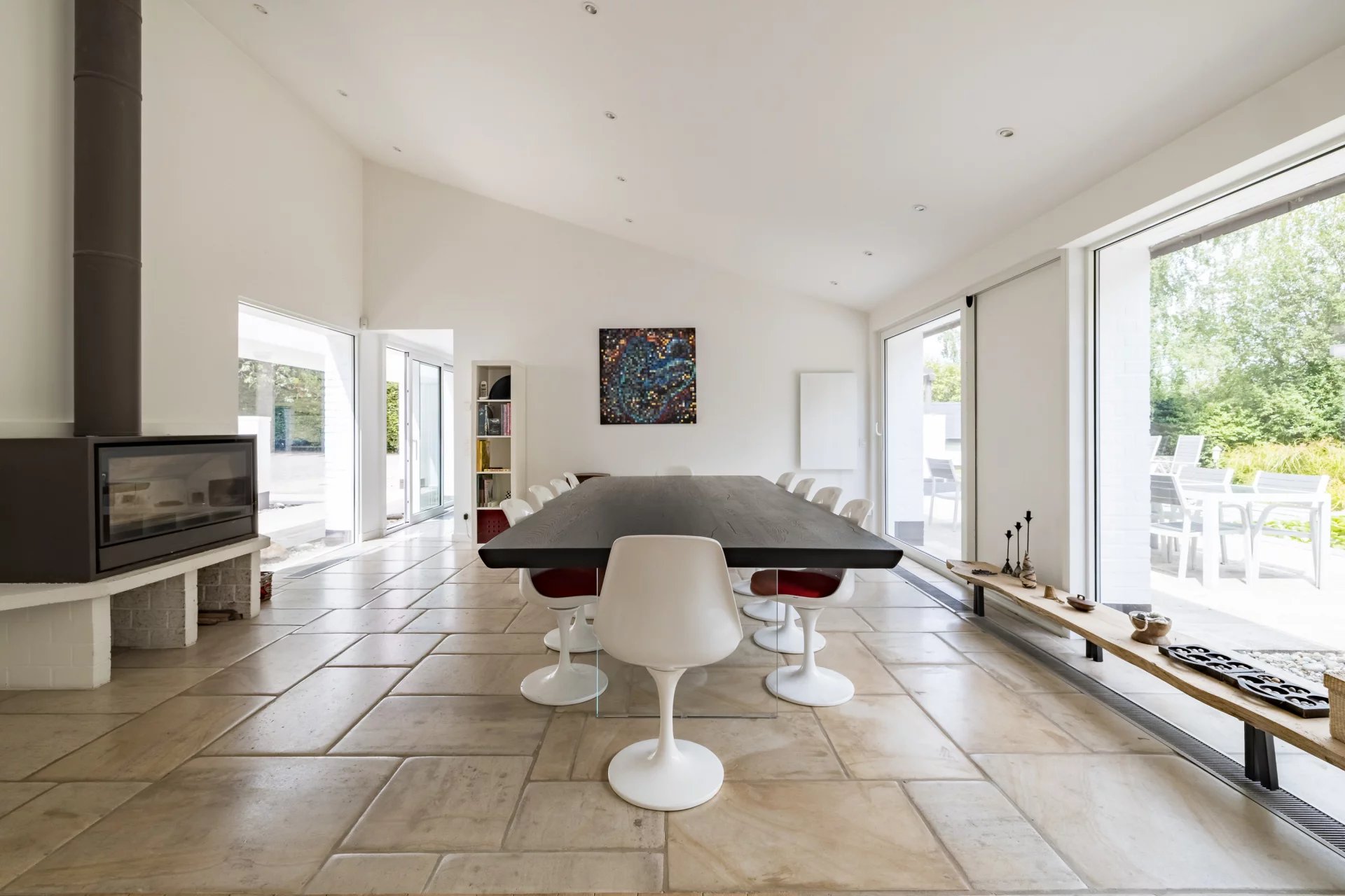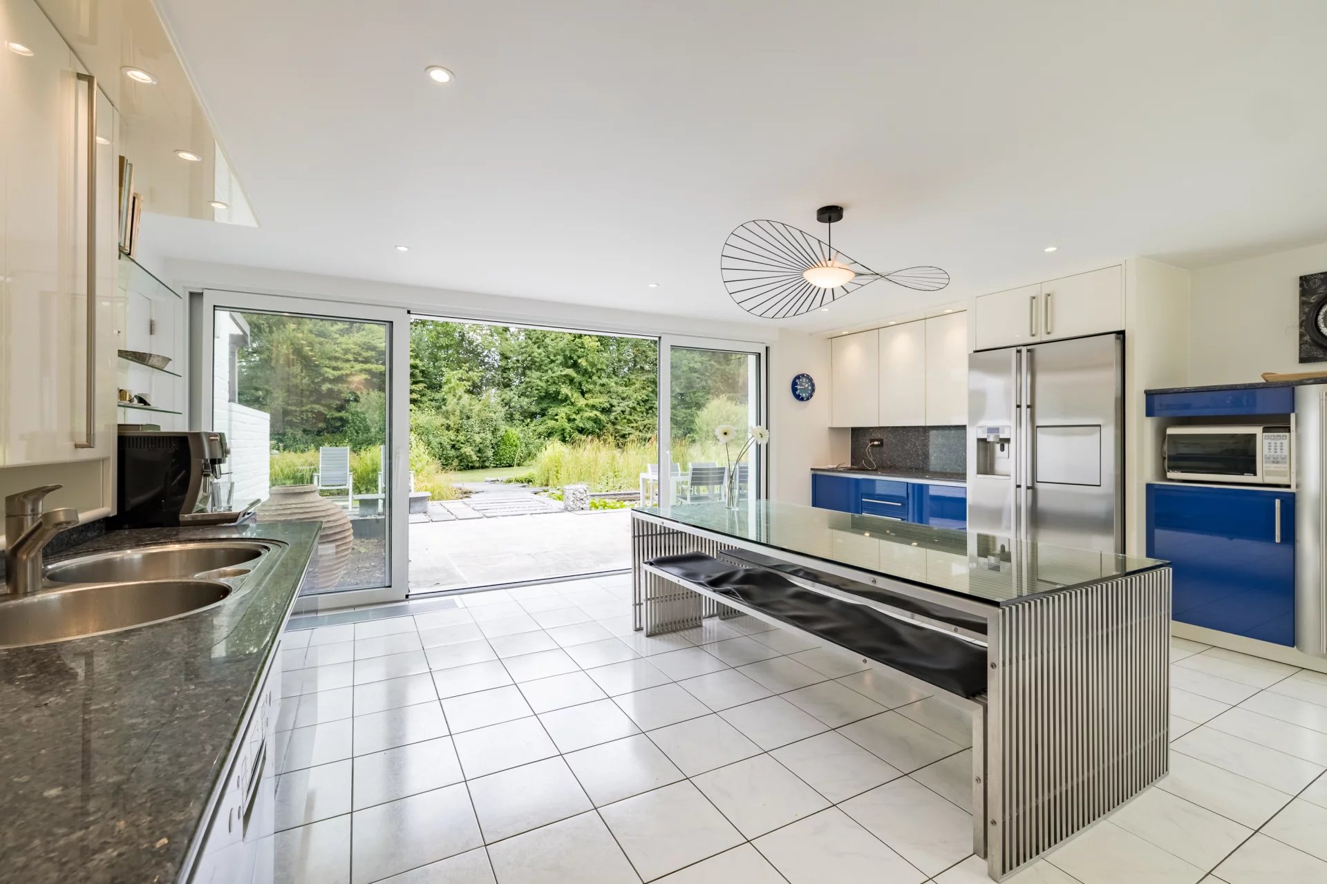Située dans un écrin de verdure, à l’abri des regards, cette villa d’architecte conjugue calme, intimité et accessibilité. Implantée sur une parcelle paysagée de ±59 ares, elle bénéficie d’un environnement serein, tout en restant proche des facilités, des transports en commun et du centre de Hoeilaart. Développant une surface habitable d’environ 600 m², la maison se compose comme suit : un vaste hall d’entrée avec vestiaire et toilettes invités, un séjour lumineux d’environ 70 m² avec feu ouvert et grande baie vitrée donnant accès à la terrasse principale orientée plein sud, un bureau/salle de jeux baigné de lumière avec accès à une seconde terrasse équipée d’un espace barbecue, une cuisine entièrement équipée, une suite parentale avec dressing et salle de bains complète, deux chambres supplémentaires avec chacune leur salle de douche, une buanderie, un garage pour trois véhicules, ainsi que deux toilettes séparées. À l’étage, deux chambres supplémentaires viennent compléter l’espace nuit. Aux sous-sol, la maison dispose de vastes caves. Un espace bien-être (à rénover) complète ce bien d’exception, comprenant une piscine intérieure, un sauna, une salle de douche, un vestiaire et des toilettes. Divers : chauffage électrique, plans d’eau, système d’alarme, robot tondeuse, adoucisseur d’eau, toiture en ardoises naturelles. Contactez-nous pour une visite : 02/880.15.17 Les informations et mesures sont données à titre indicatif et non contractuelles.