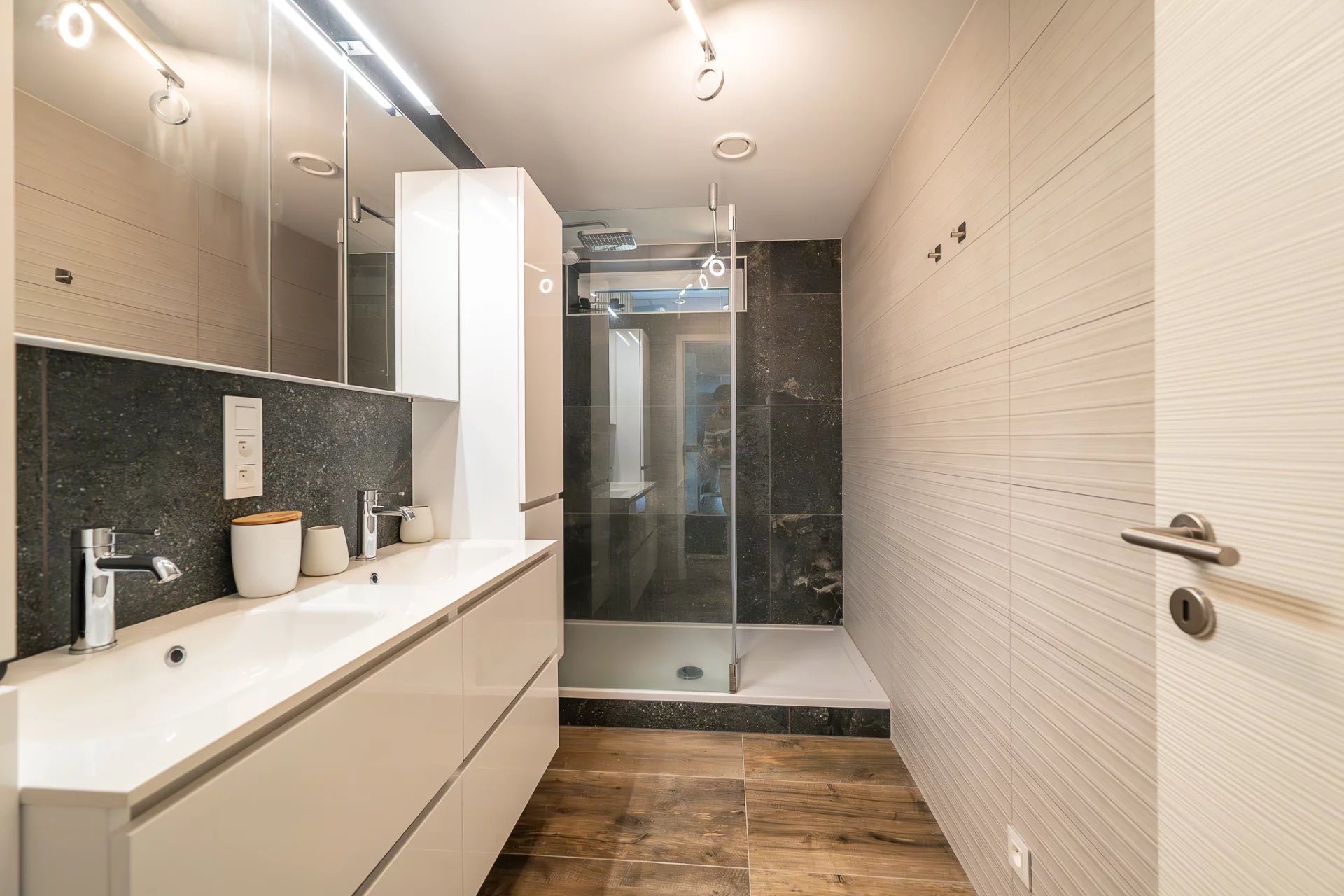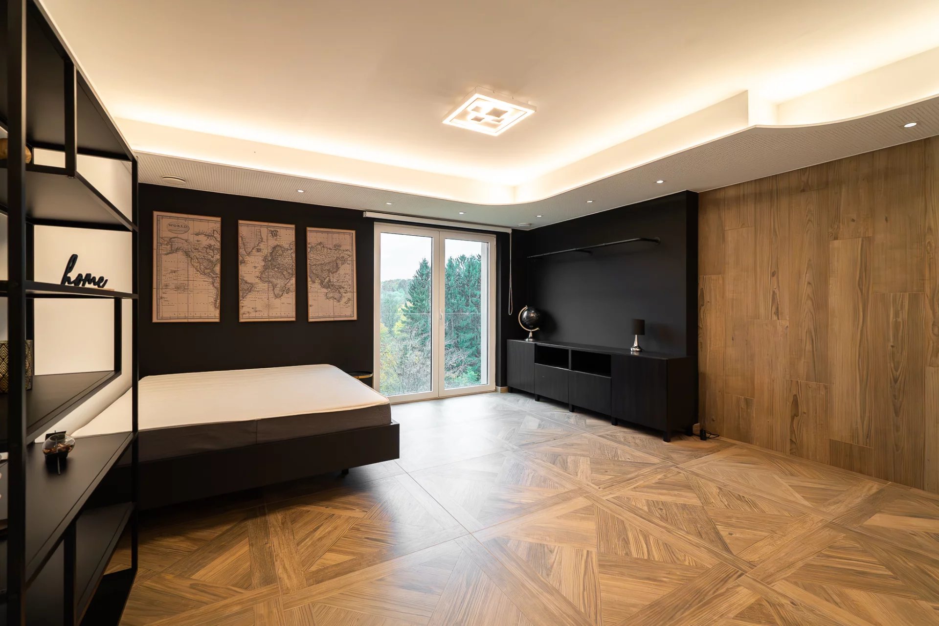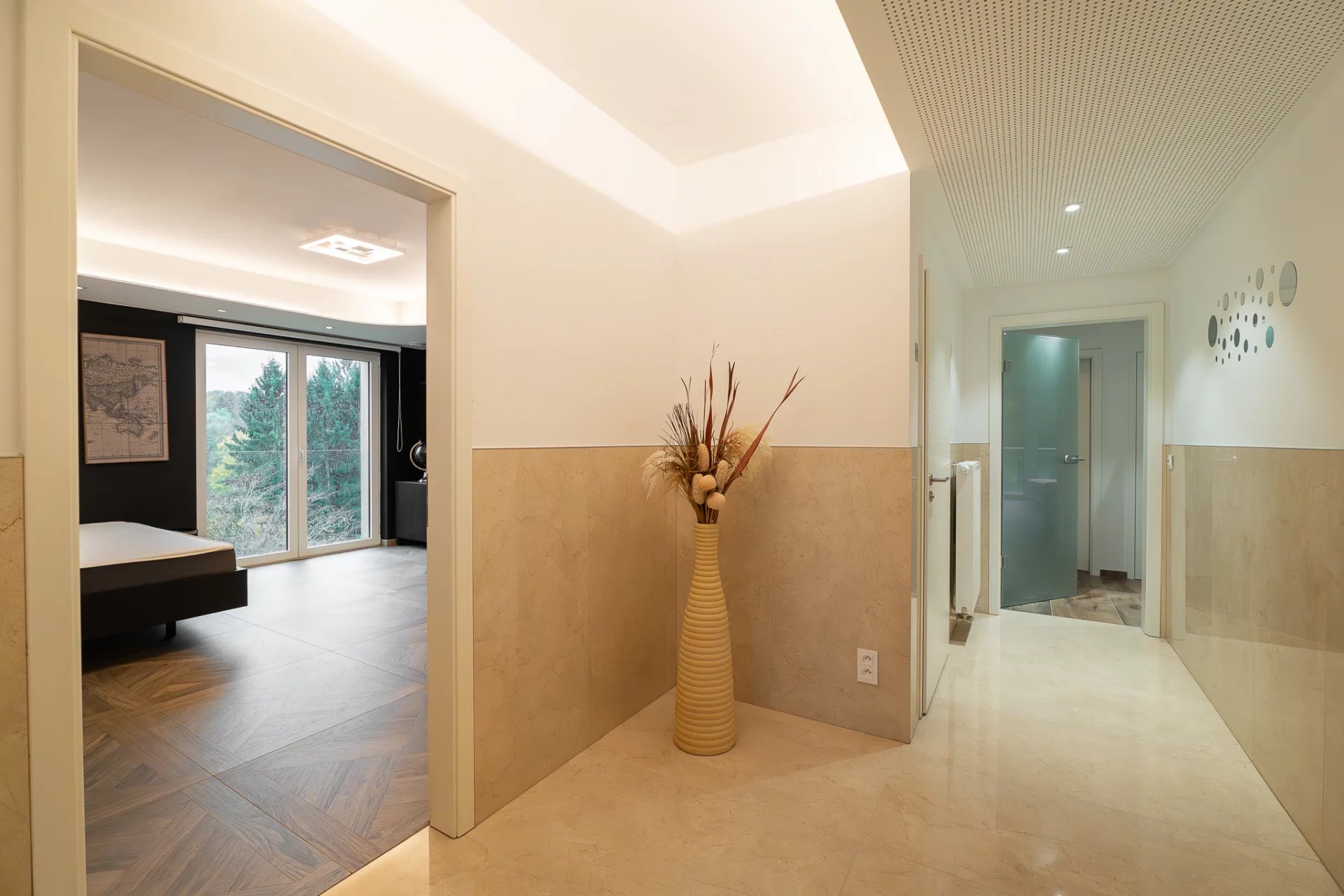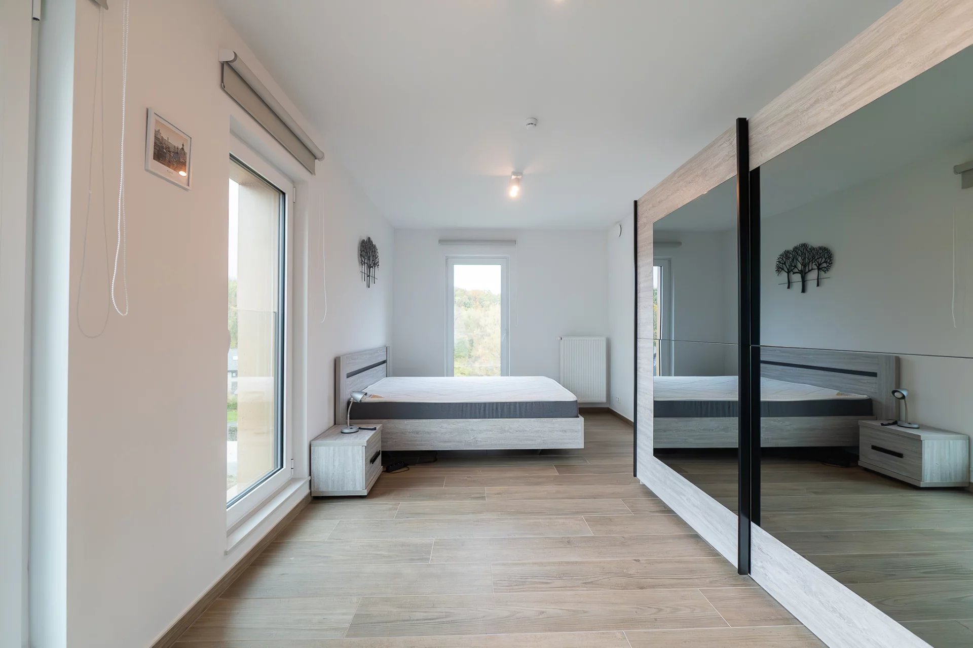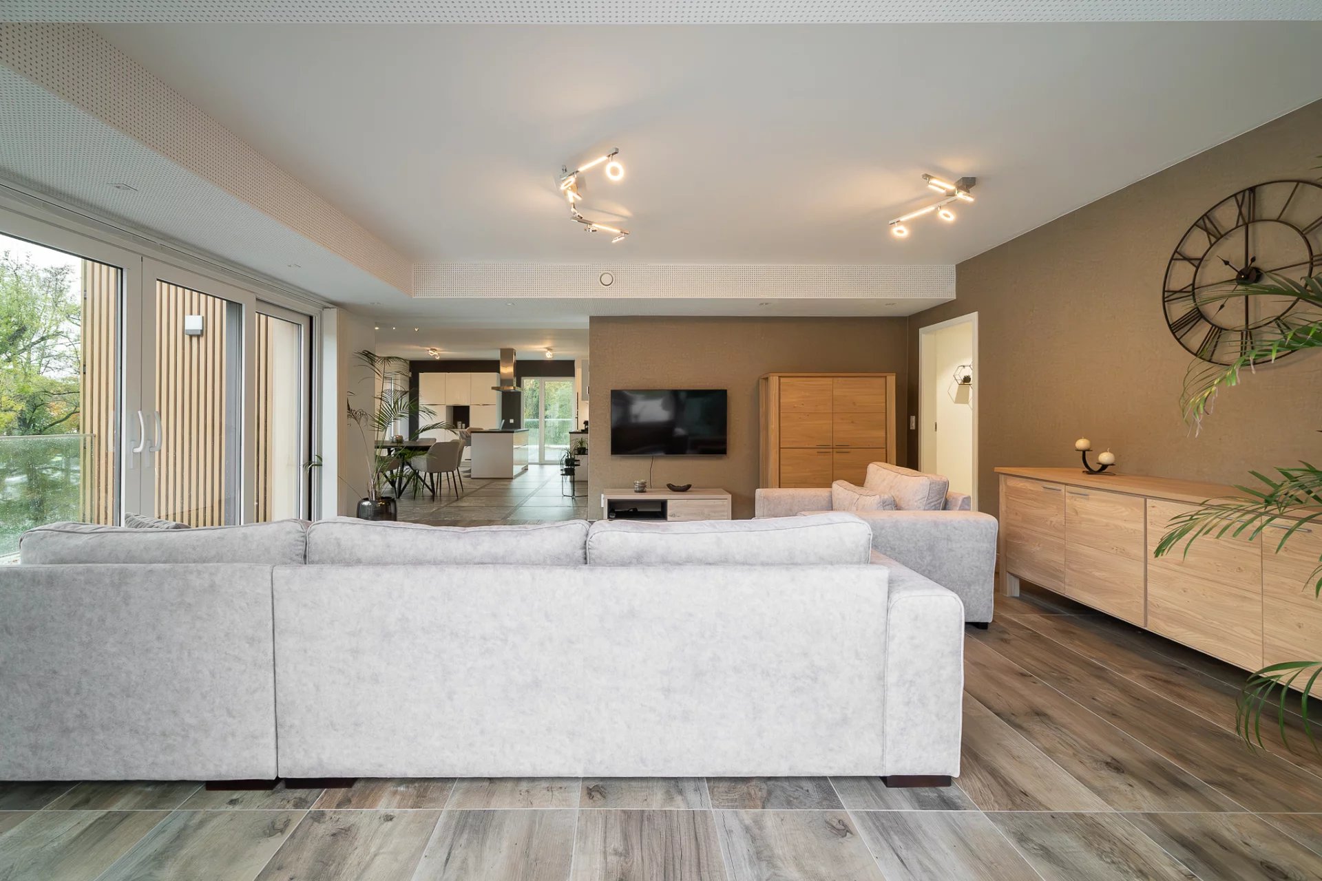 Idéalement situé en bordure du lac de Warfa, ce penthouse de 2021 développe ±168 m² habitables et offre un cadre de vie rare par son environnement verdoyant et ses 96 m² de terrasses. L’appartement se compose d’un vaste séjour de ± 68 m² aux larges baies vitrées, prolongé par une cuisine ouverte entièrement équipée. La partie nuit comprend trois chambres, dont une suite parentale avec salle de bains privative et terrasse, une seconde salle de douche, ainsi qu’une buanderie et deux toilettes séparées. La circulation intérieure fluide et la quadruple orientation assurent une luminosité remarquable tout au long de la journée. Les terrasses de 12, 25 et 58 m² invitent à la détente et offrent des vues dégagées sur le lac et la nature environnante. Sur le plan technique : certification énergétique PEB A+, VMC double flux, dix panneaux photovoltaïques, vidéophone, cave privative, un emplacement de parking intérieur et un extérieur en option.