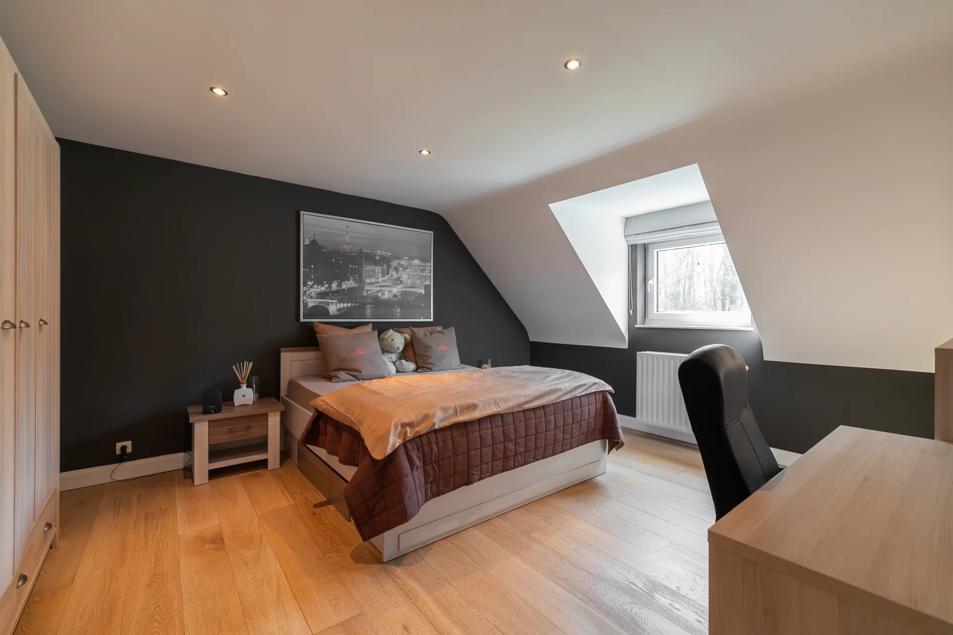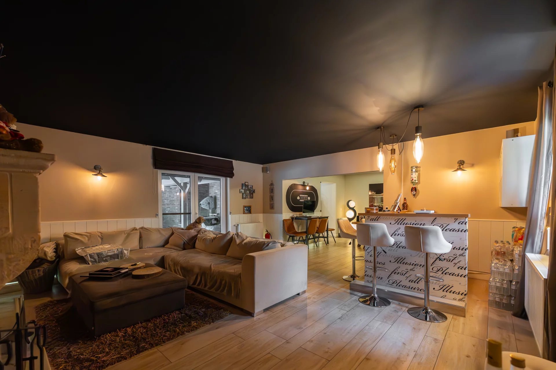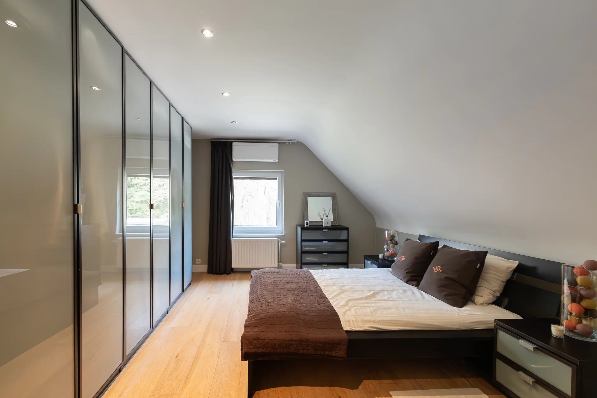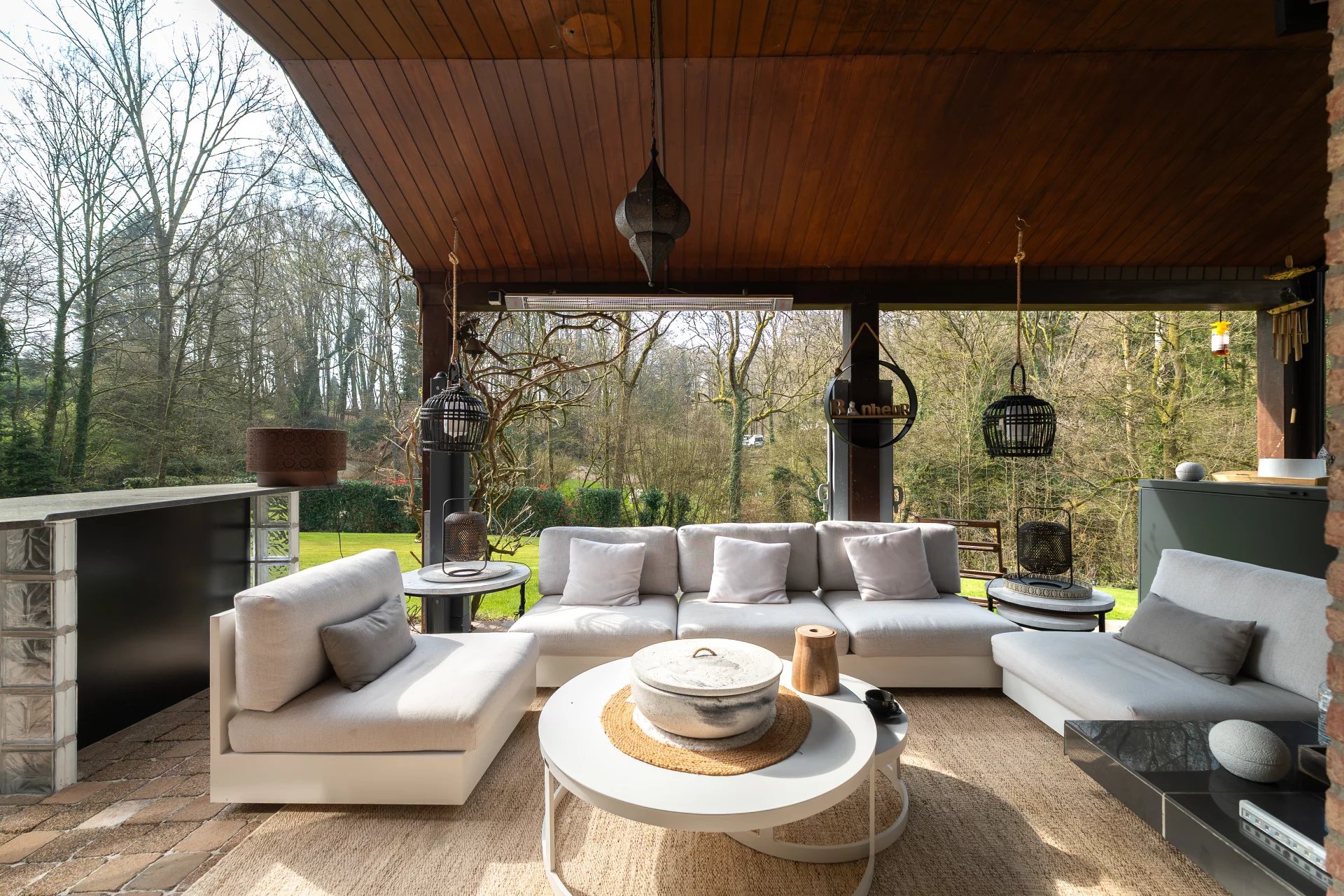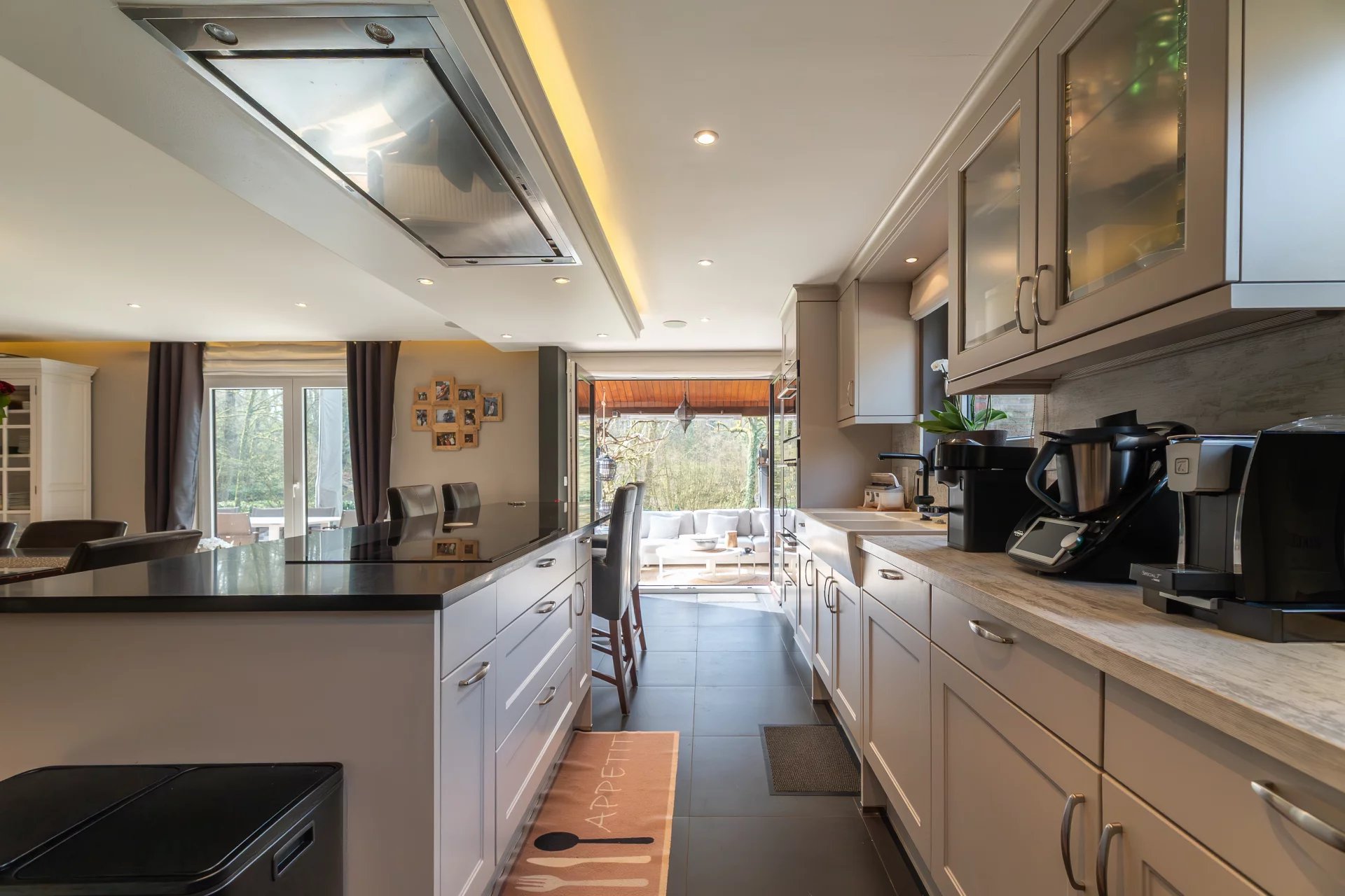 OPTION - Nichée dans le Bois du Hautmont, sur un terrain de fond arboré de ± 76 ares, villa brabançonne entièrement rénovée en 2024 développant ± 583m² selon PEB. Elle comprend 4 chambres, 2 salles de bains ainsi qu’un appartement indépendant de ± 100 m² avec 2 chambres et entrée privative. Le hall d’entrée s’ouvre sur un séjour de ± 90 m² prolongé par une cuisine ouverte entièrement équipée. Deux salons distincts complètent le rez-de-chaussée : un salon d’été et un salon d’hiver avec cheminée, actuellement aménagé en bureau. À l’étage, trois chambres lumineuses se partagent une salle de bains ; la suite parentale dispose d’un dressing et d’une salle d’eau. Toutes les pièces bénéficient d’une climatisation réversible. L’appartement indépendant propose séjour, cuisine, terrasse, buanderie et grenier, idéal pour profession libérale ou logement de service. L’espace bien-être comprend piscine chauffée (11 x 5,5 m), sauna, salle de sport équipée et cuisine d’été. Terrasse plein sud de ± 106 m² avec salon couvert, bar et barbecue. PEB B. Isolation renforcée, nouveaux châssis, 44 panneaux solaires, chaudière Buderus, boiler thermodynamique. Garage 4 voitures, 6 carports, domotique complète, portail automatique. Informations et mesures données à titre indicatif et non contractuelles.