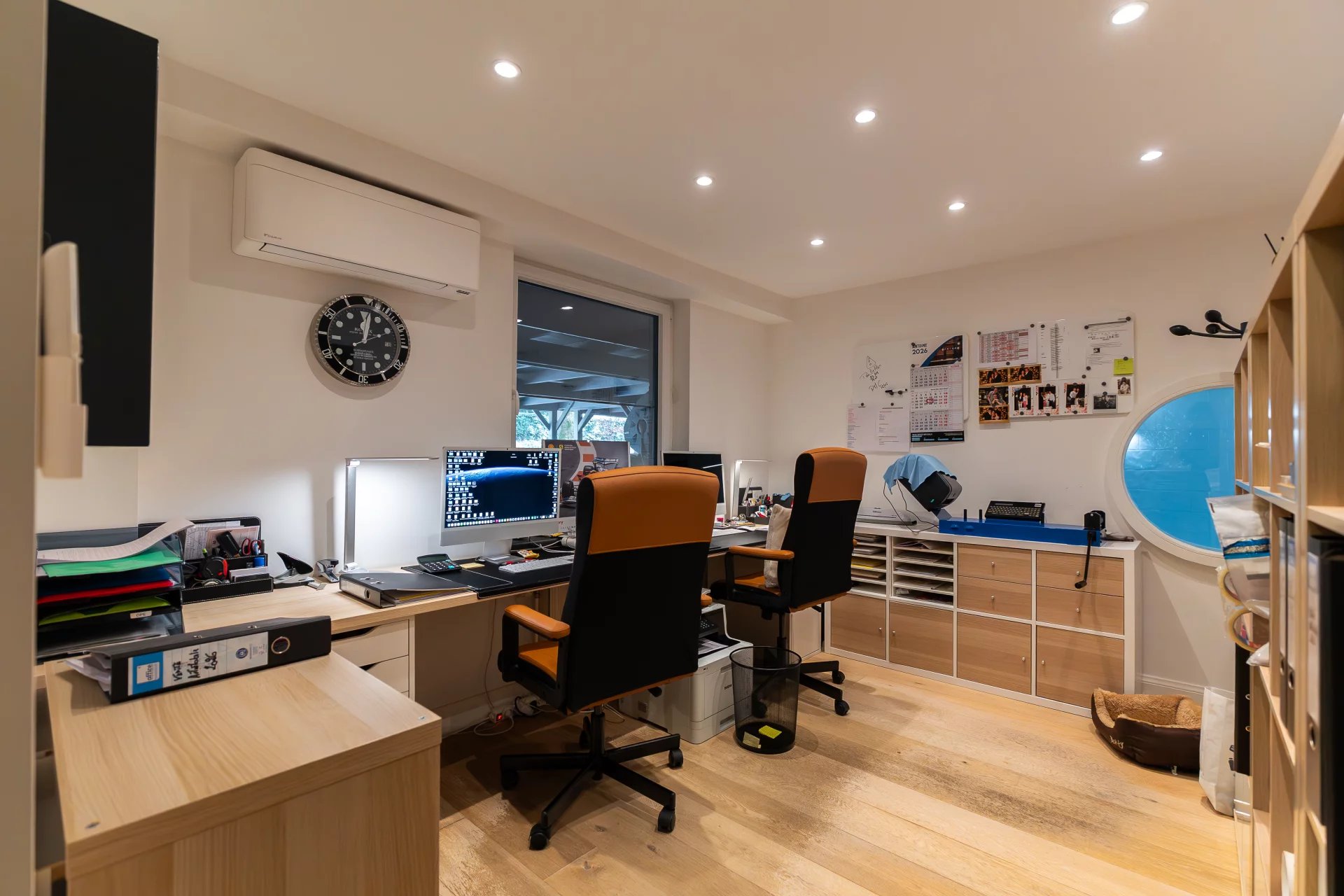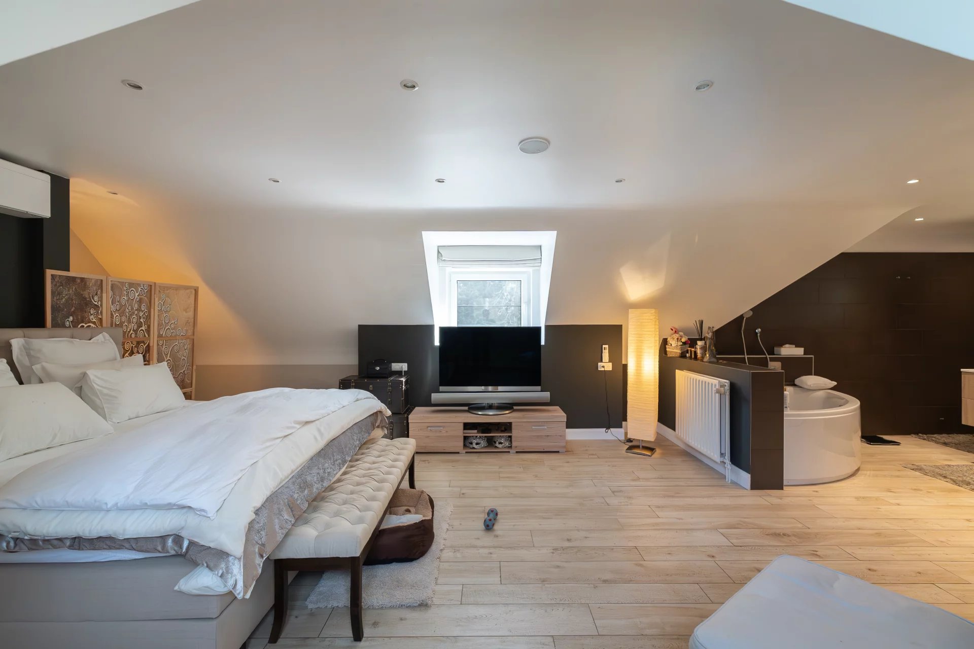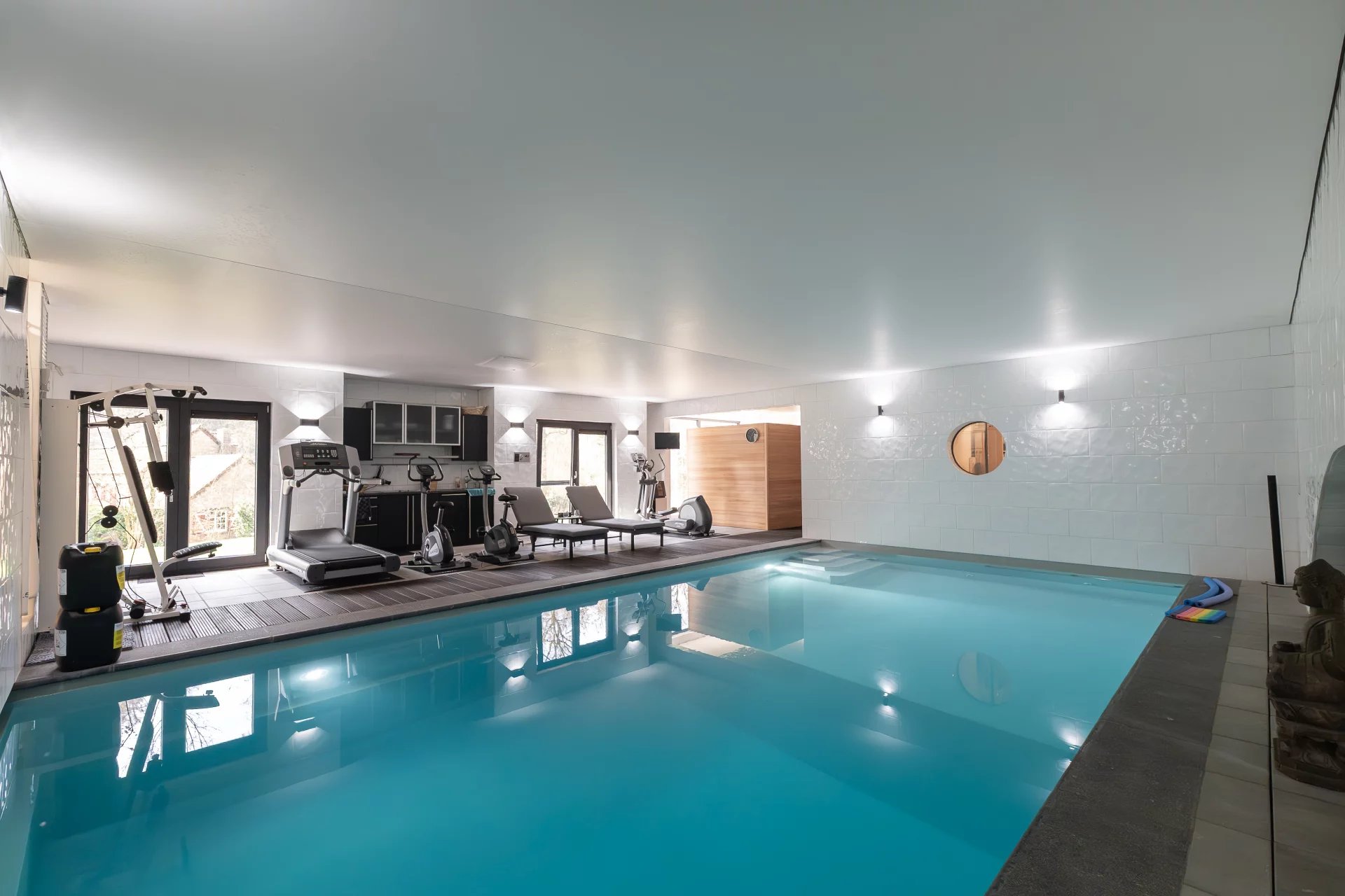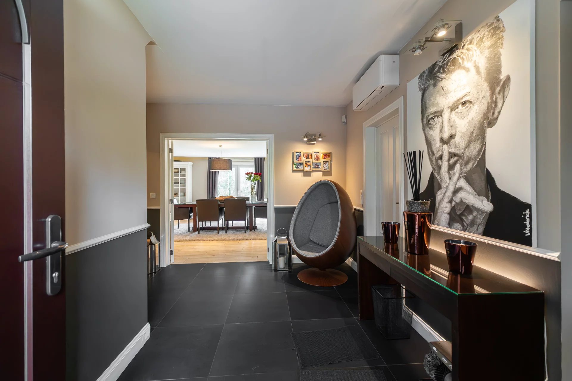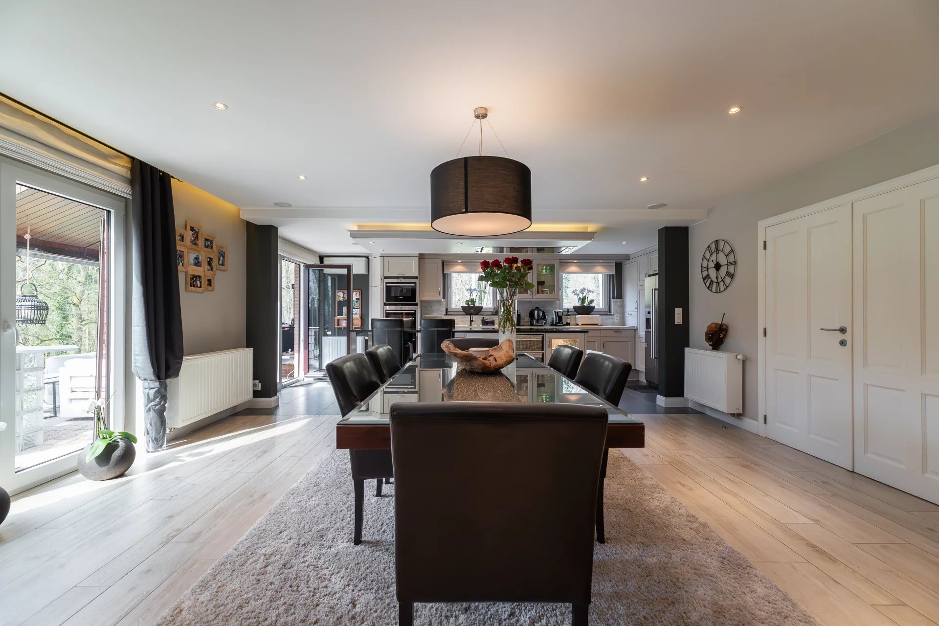 OPTION - Nichée dans le Bois du Hautmont, sur un terrain de fond arboré de ± 76 ares, villa brabançonne entièrement rénovée en 2024 développant ± 583m² selon PEB. Elle comprend 4 chambres, 2 salles de bains ainsi qu’un appartement indépendant de ± 100 m² avec 2 chambres et entrée privative. Le hall d’entrée s’ouvre sur un séjour de ± 90 m² prolongé par une cuisine ouverte entièrement équipée. Deux salons distincts complètent le rez-de-chaussée : un salon d’été et un salon d’hiver avec cheminée, actuellement aménagé en bureau. À l’étage, trois chambres lumineuses se partagent une salle de bains ; la suite parentale dispose d’un dressing et d’une salle d’eau. Toutes les pièces bénéficient d’une climatisation réversible. L’appartement indépendant propose séjour, cuisine, terrasse, buanderie et grenier, idéal pour profession libérale ou logement de service. L’espace bien-être comprend piscine chauffée (11 x 5,5 m), sauna, salle de sport équipée et cuisine d’été. Terrasse plein sud de ± 106 m² avec salon couvert, bar et barbecue. PEB B. Isolation renforcée, nouveaux châssis, 44 panneaux solaires, chaudière Buderus, boiler thermodynamique. Garage 4 voitures, 6 carports, domotique complète, portail automatique. Informations et mesures données à titre indicatif et non contractuelles.