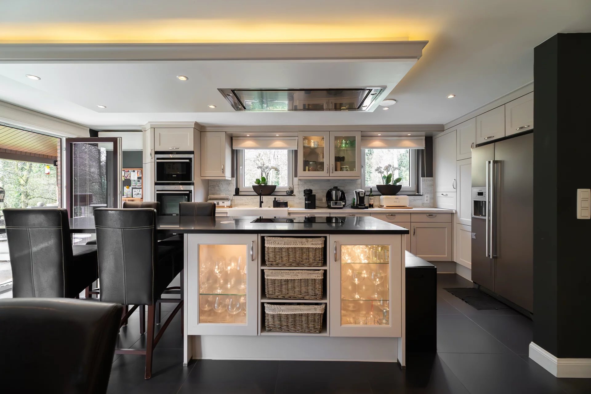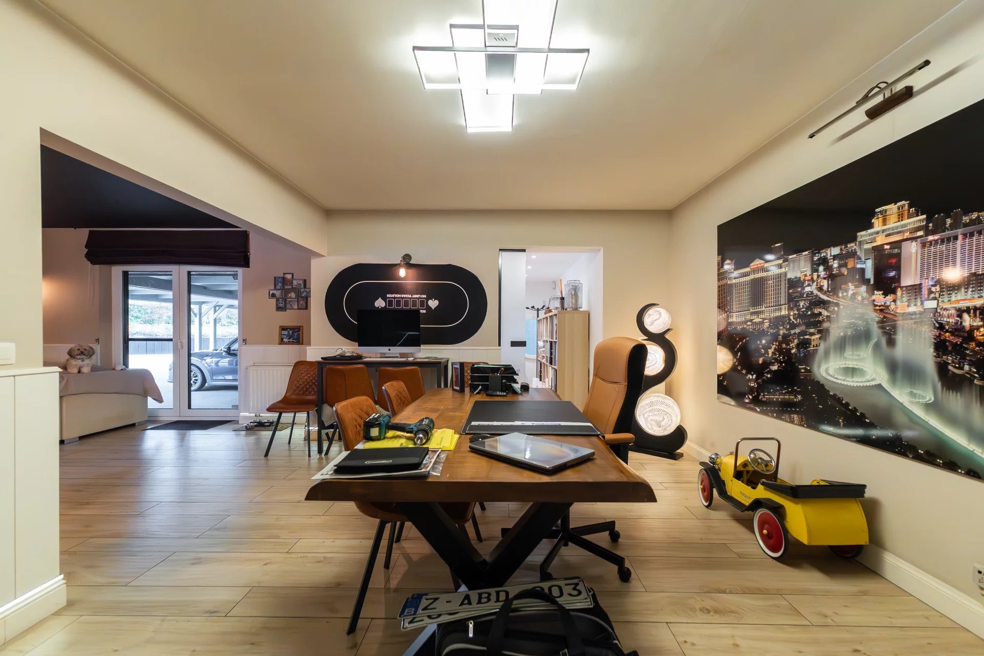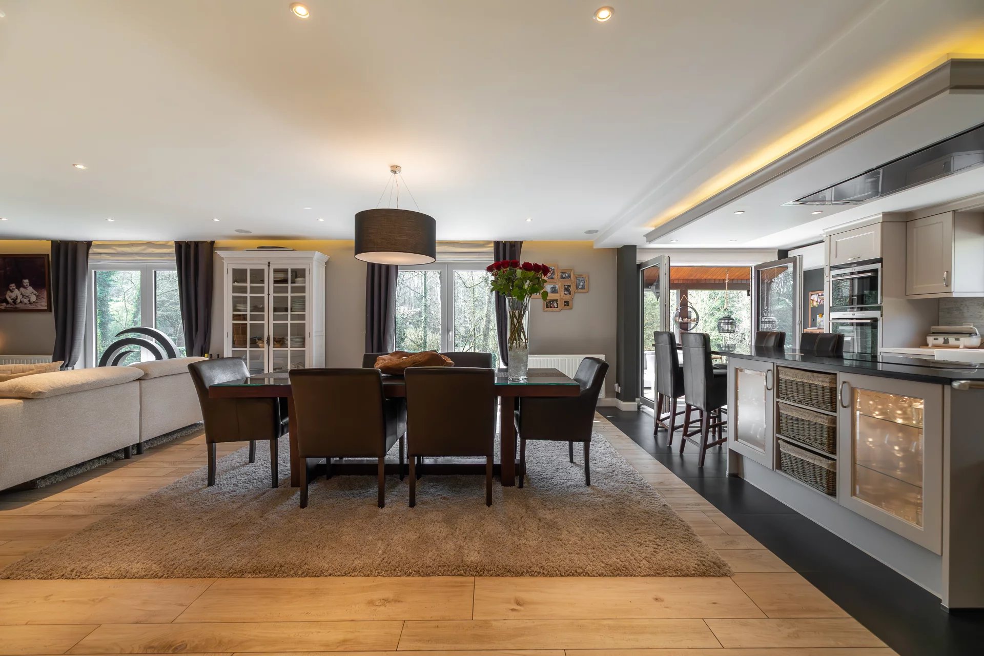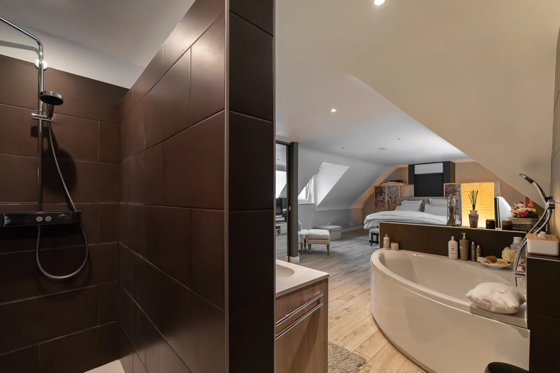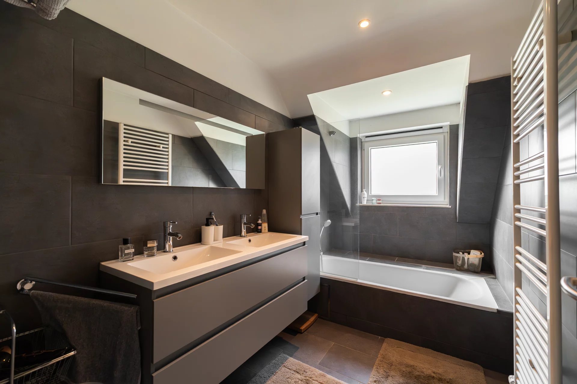 OPTION - Nichée dans le Bois du Hautmont, sur un terrain de fond arboré de ± 76 ares, villa brabançonne entièrement rénovée en 2024 développant ± 583m² selon PEB. Elle comprend 4 chambres, 2 salles de bains ainsi qu’un appartement indépendant de ± 100 m² avec 2 chambres et entrée privative. Le hall d’entrée s’ouvre sur un séjour de ± 90 m² prolongé par une cuisine ouverte entièrement équipée. Deux salons distincts complètent le rez-de-chaussée : un salon d’été et un salon d’hiver avec cheminée, actuellement aménagé en bureau. À l’étage, trois chambres lumineuses se partagent une salle de bains ; la suite parentale dispose d’un dressing et d’une salle d’eau. Toutes les pièces bénéficient d’une climatisation réversible. L’appartement indépendant propose séjour, cuisine, terrasse, buanderie et grenier, idéal pour profession libérale ou logement de service. L’espace bien-être comprend piscine chauffée (11 x 5,5 m), sauna, salle de sport équipée et cuisine d’été. Terrasse plein sud de ± 106 m² avec salon couvert, bar et barbecue. PEB B. Isolation renforcée, nouveaux châssis, 44 panneaux solaires, chaudière Buderus, boiler thermodynamique. Garage 4 voitures, 6 carports, domotique complète, portail automatique. Informations et mesures données à titre indicatif et non contractuelles.