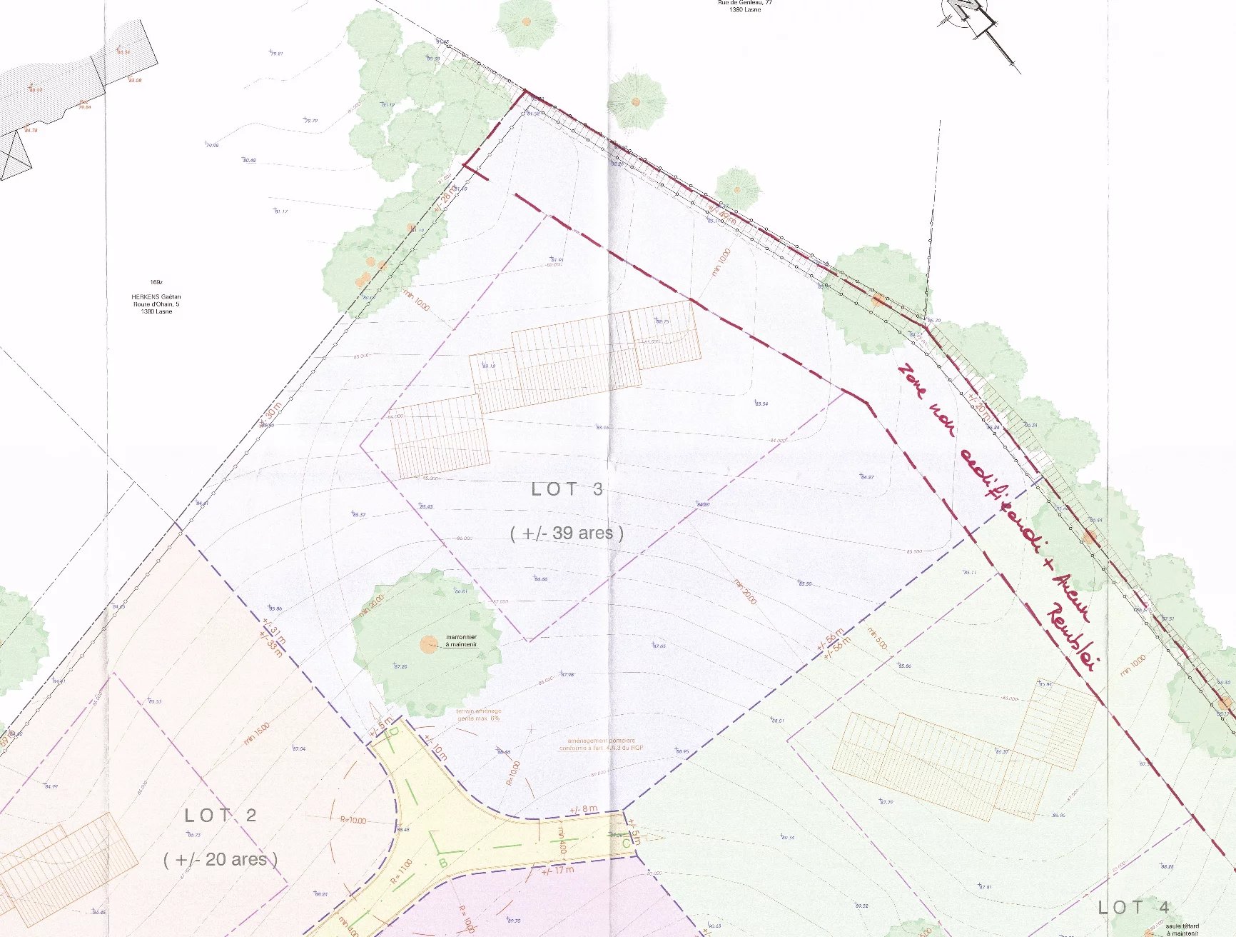 OPTION - Situé dans un environnement résidentiel paisible de Lasne, ce terrain de fond à bâtir développe une superficie de ±39,30 ares. Niché au sein d’un lotissement soigné et accessible par une petite voirie locale, il offre un cadre verdoyant et une intimité préservée. Le terrain présente un taux d’occupation au sol de 10 %, autorisant la construction d’une villa quatre façades d’architecture contemporaine ou classique. Son orientation plein Sud garantit un ensoleillement optimal tout au long de la journée et des vues dégagées sur la campagne environnante. Les équipements techniques sont aisément accessibles : raccordement aux égouts dans la rue, impétrants à proximité. Une belle opportunité de concrétiser un projet résidentiel au sein d’un quartier recherché de Lasne, alliant tranquillité, nature et qualité de vie.